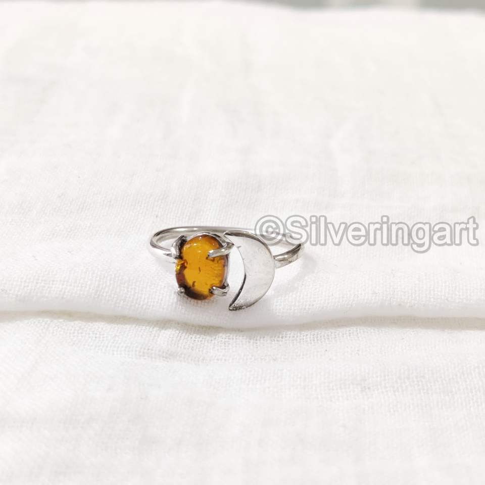 Women's Ring Natural Baltic Amber Gemstone Amber Birthstone Crescent Moon Christmas Handmade Jewelry 925 Sterling Silver Ring
