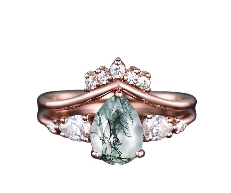 Women's Rose Gold Plated Wedding Fine Jewelry Moss Agate Pear Cut Bridal Band with Diamond Studded Silver Party Christmas Gift