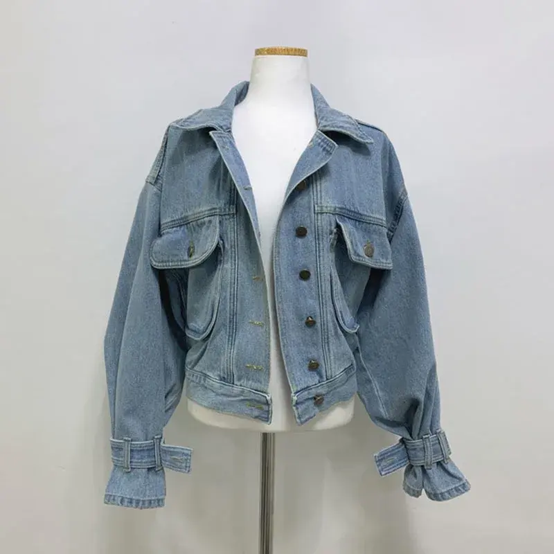 Women's Ruffle Stitching Washed Denim Jacket Casual Thin Long Sleeve Lapel Single Breasted Short Coat Winter Autumn Outwear
