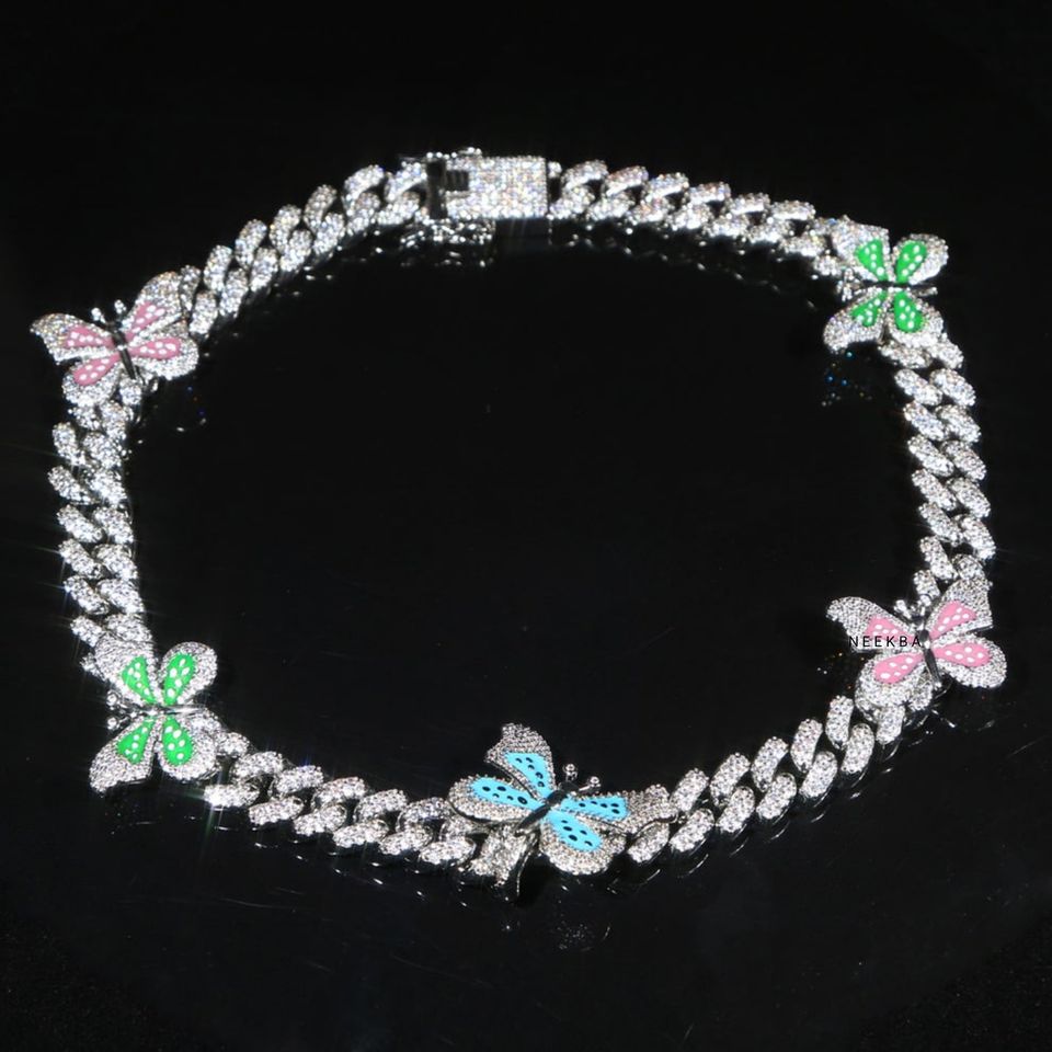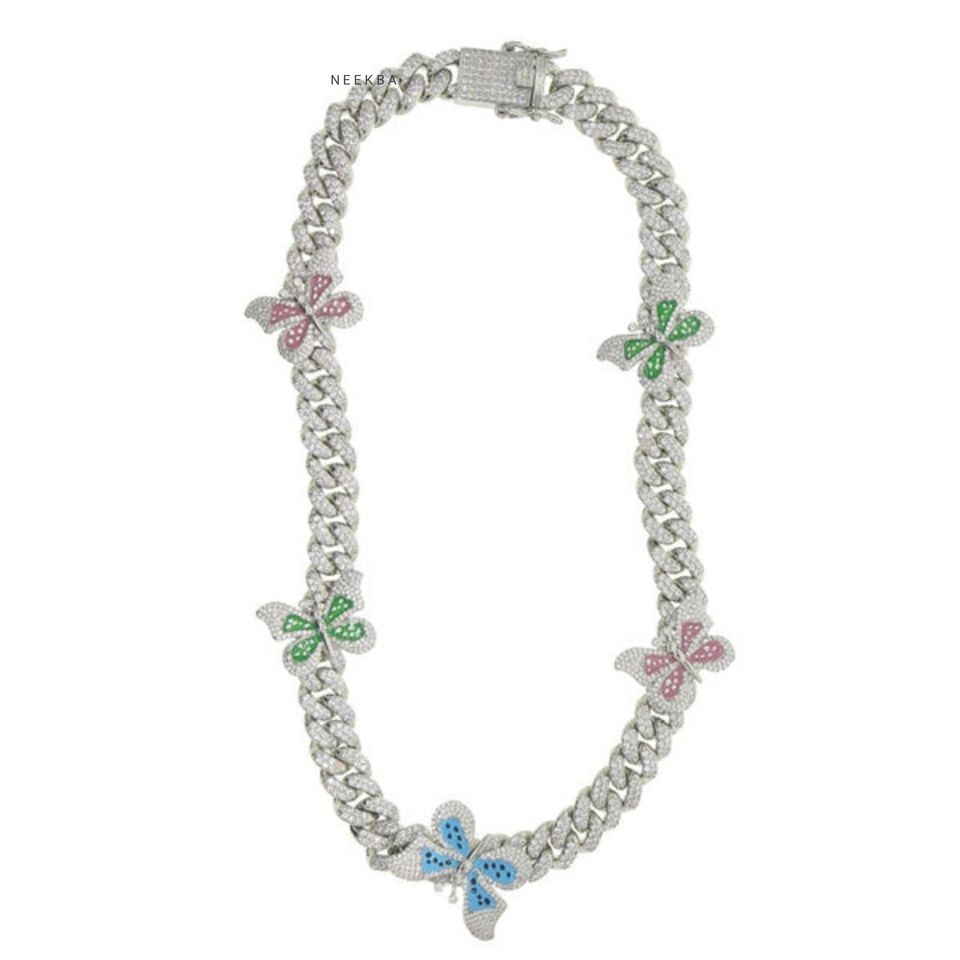 Women's S925 Multi-Colored Butterfly Cuban Link Choker - Moissanite Iced Out Chain for Women, Delicate Daily Wear Necklace