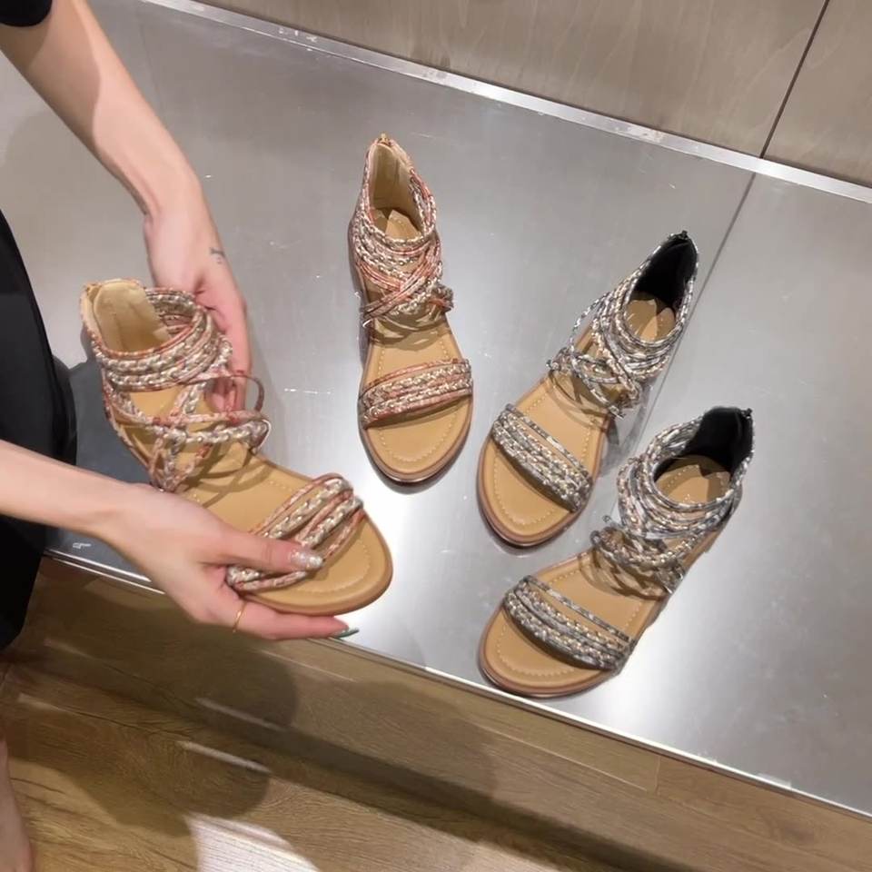 Women's Sandals Flat Bottom Roman Cross Strap Bohemian Beach Shoes Women's Seaside Holiday Shoes