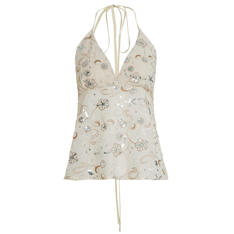 Women‘s Sequin Embroidery Halter Top Backless Tie Up Sleeveless Y2K Camisole Sexy Party Clubwear Summer Tank Top