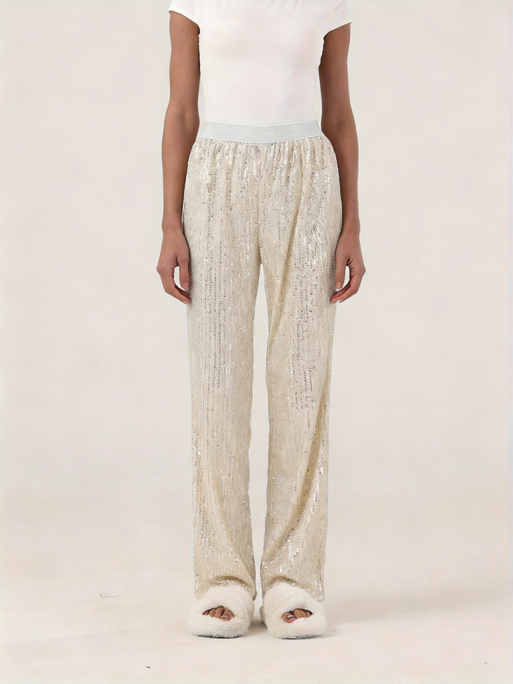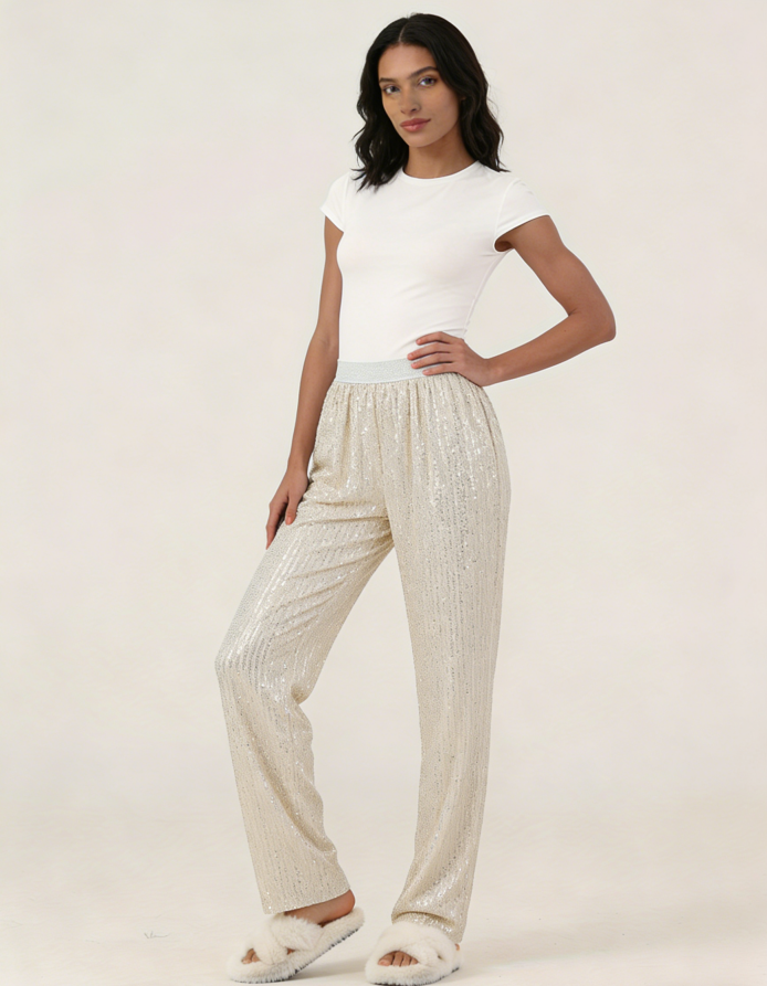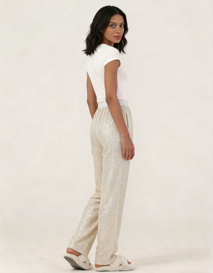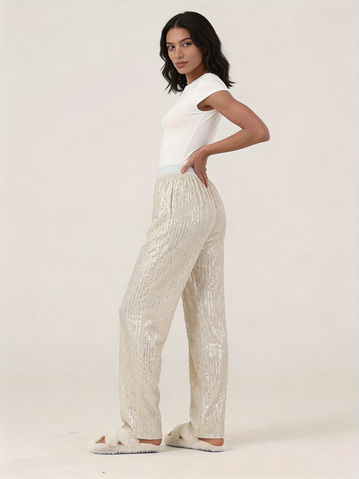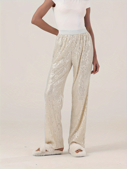 Women's Sequin Wide Leg Pants with Soft Skin-Friendly Lining, Non-Irritating Elastic Waist Sparkly Trousers