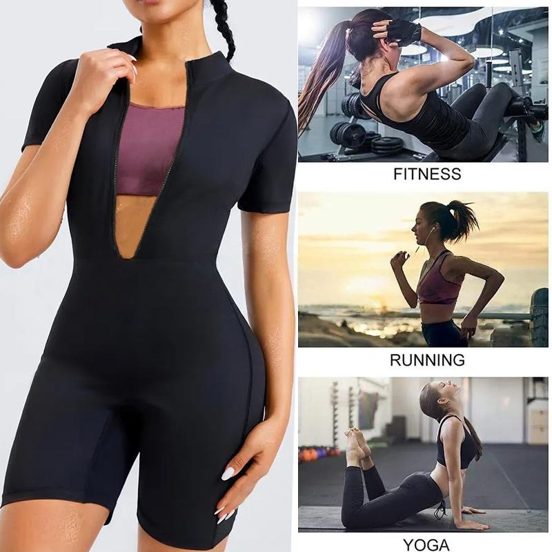Women's Short Sleeve Sauna Suit Shapewear Bodysuit Waist Trainer Tummy Control Butt Lifting Yoga Sweat Jumpsuit