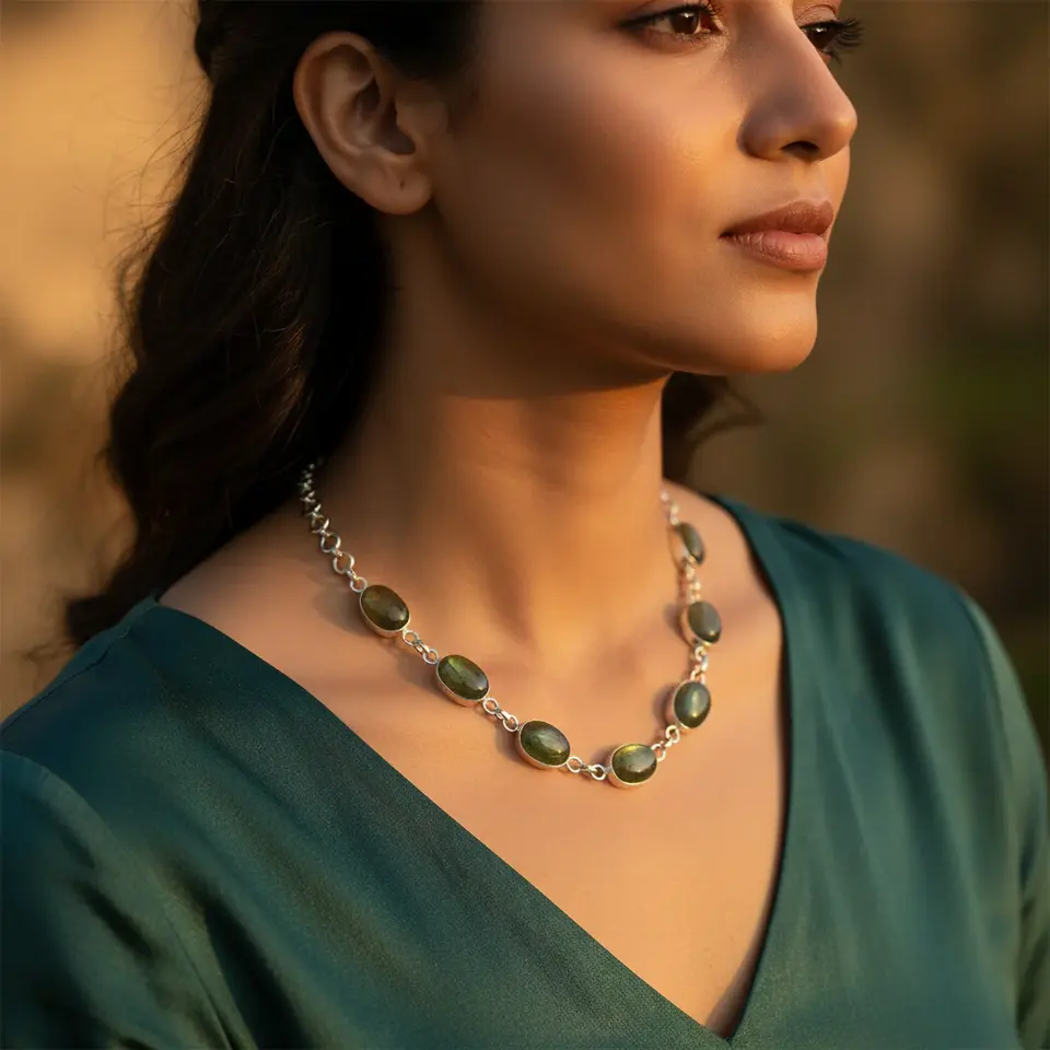 Women's Silver Labradorite Necklace Geometric Pattern Rhodium-Plated Platinum Rose Gold Diamond Moissanite Collection Sterling