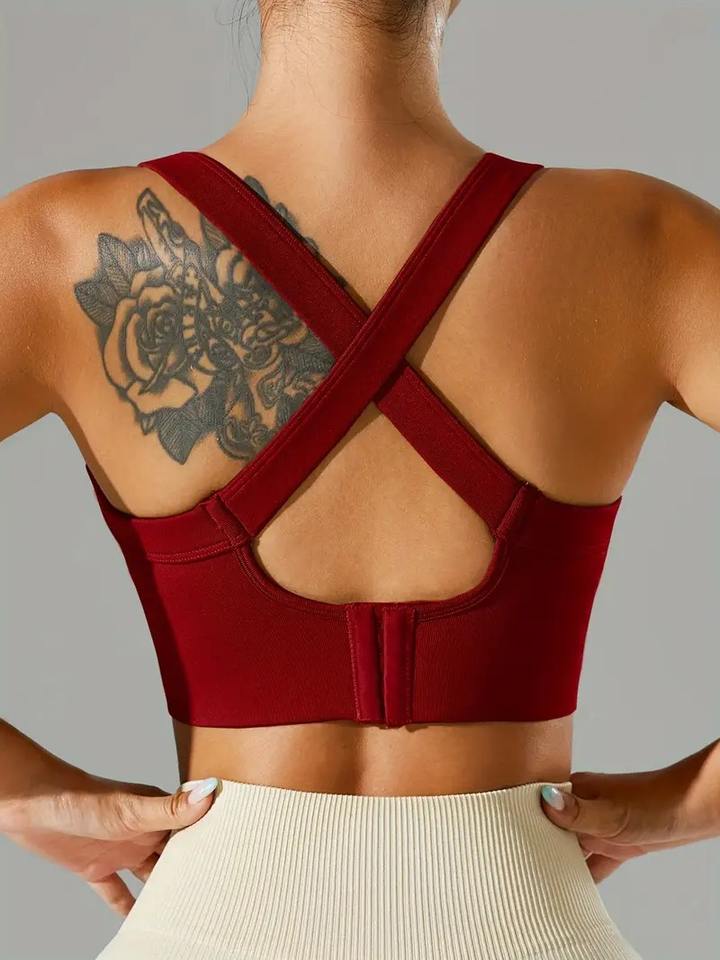 Women's Simple Style Solid Color Sports Bra Crisscross Strappy Back Slim-Fit Athletic Tank Vest for Yoga Fitness Front Logo
