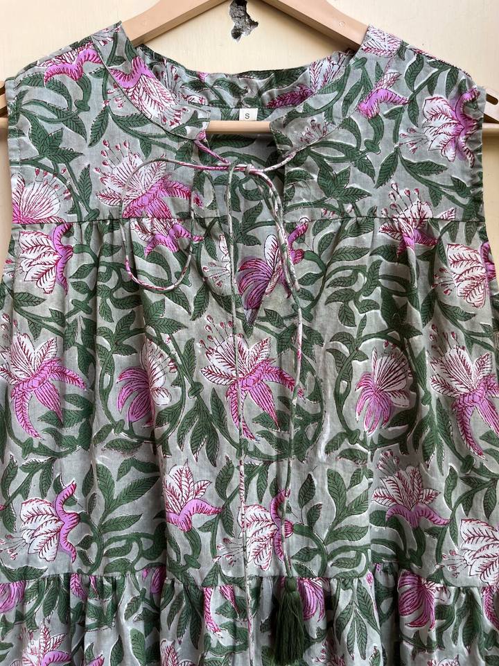 Women's Sleeveless Indian Cotton Summer Dress Gray Long Gown with Hand Block Printed Floral Design ODM Supply