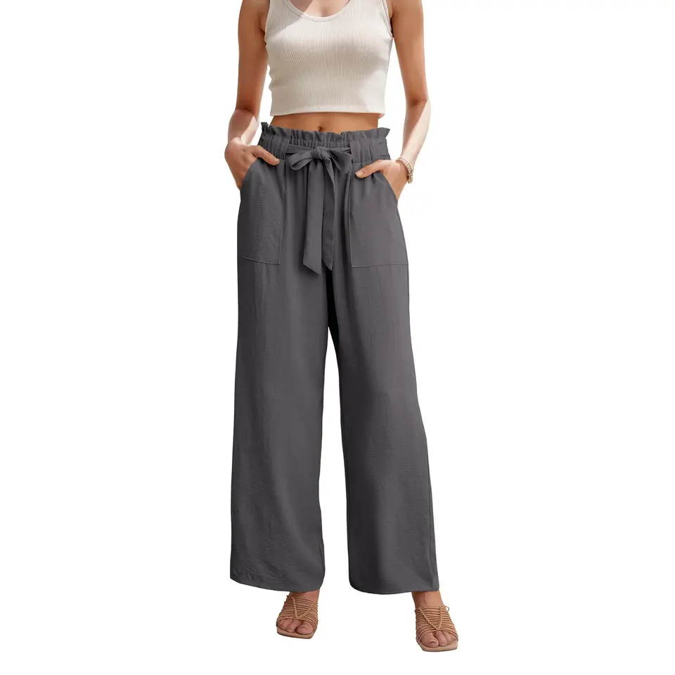 Women's Smoky Gray High Waist Wide Leg Lace Work Pants Business Casual Summer Trousers Adjustable Knot Pockets Streetwear Style