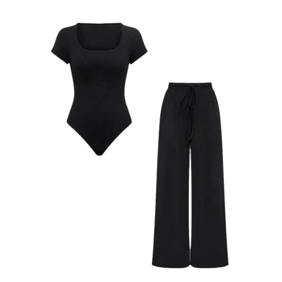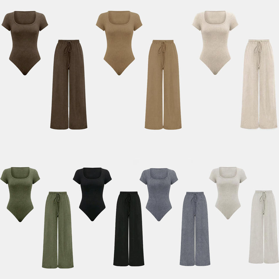 Women's Solid-Color Ribbed Casual Jumpsuit & Pants Casual 2-Piece Set Fashion