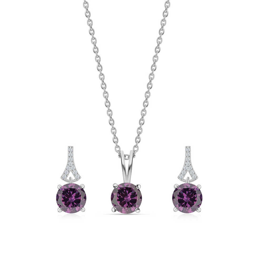 Women's Sterling Silver Lab Created Amethyst AAA Grade American Diamond Solitaire Jewelry Set Geometric Flower Pattern for