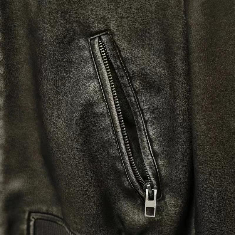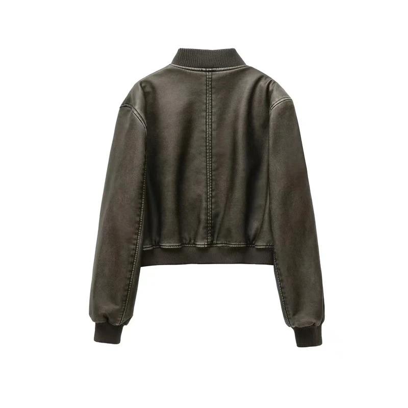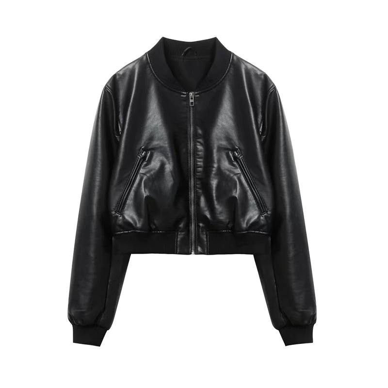 Women's Street fashion Faux Leather Bomber Jacket Stand Collar Black Short Leather jacket