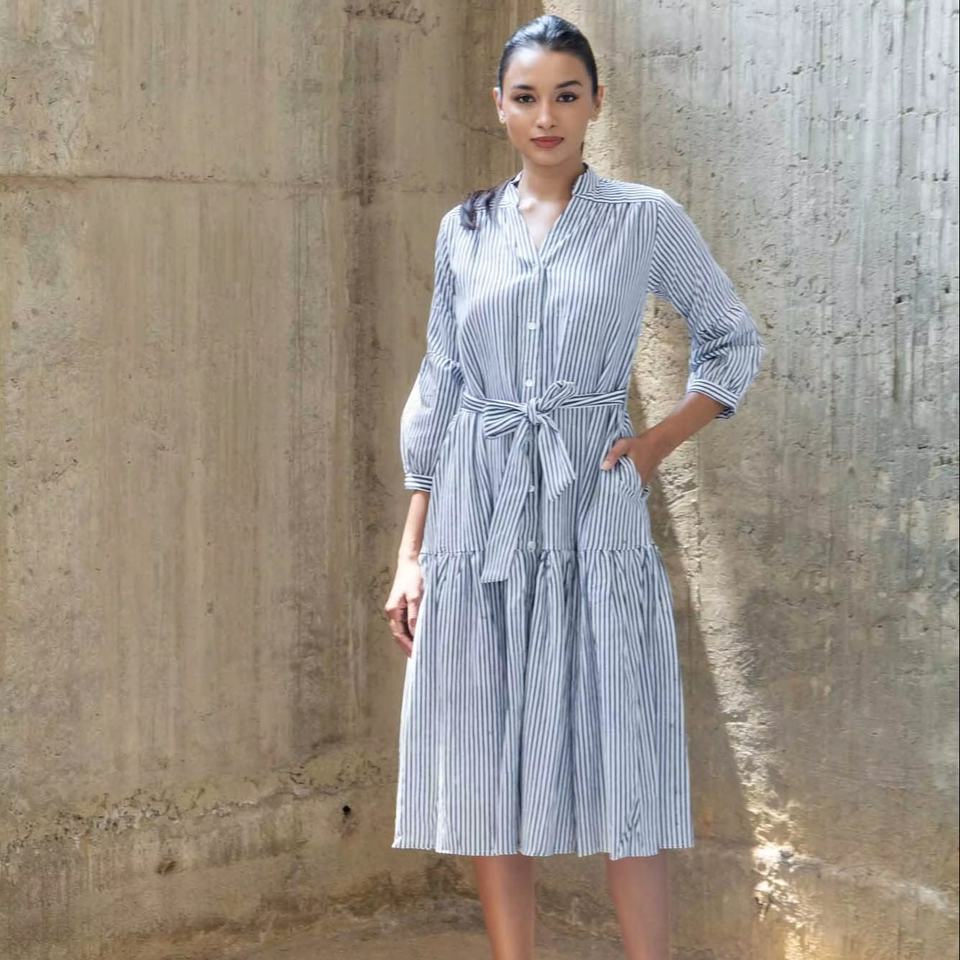 Women's Striped A-Line Midi Dress Puff Sleeves Tie-Up Detail White Blue Solid Pattern Digital Printing Autumn Season