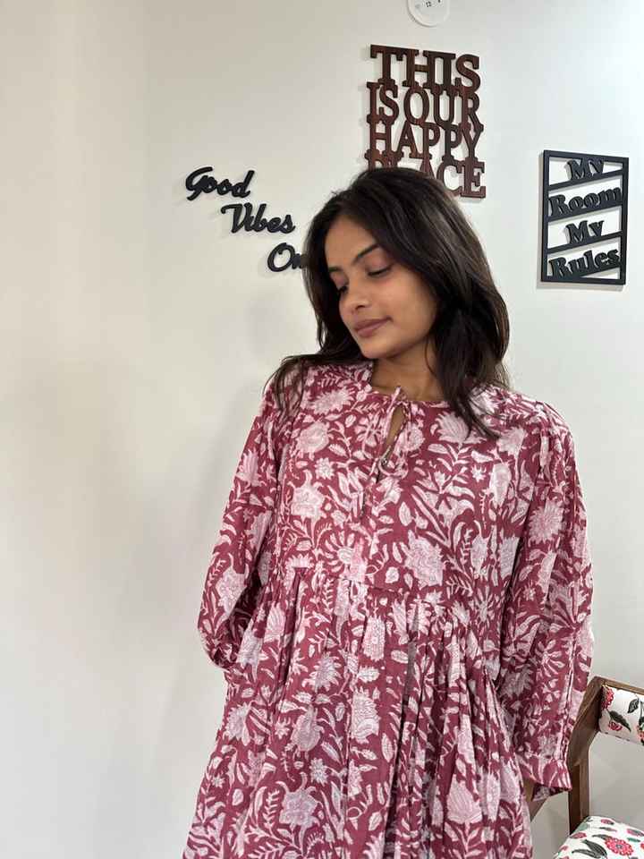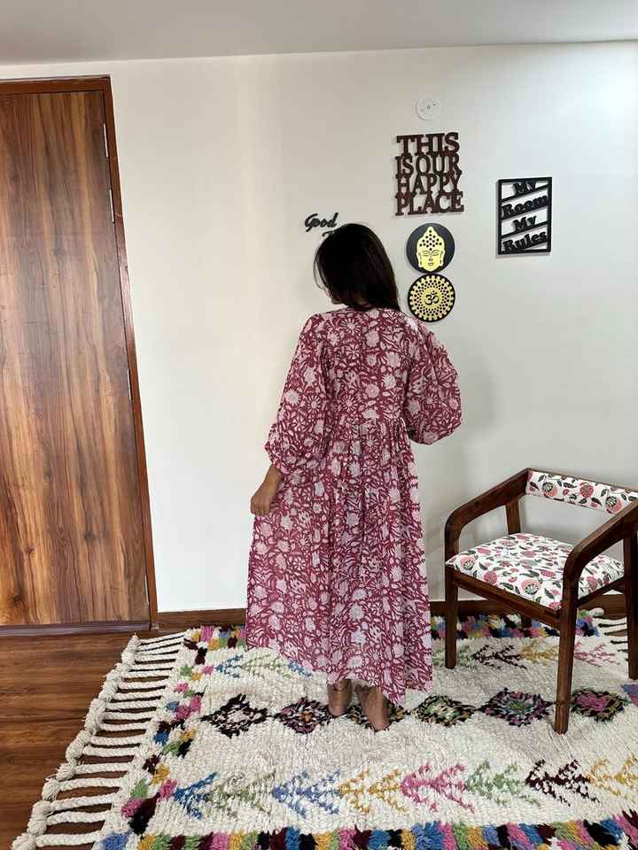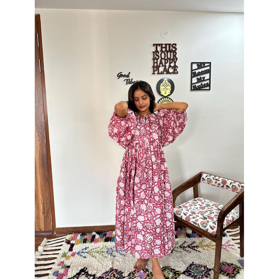 Women's Summer Casual Bohemian Woven Cotton Eco-Friendly Washable Block Print Floral Hand Block Printed Maxi Dress Button