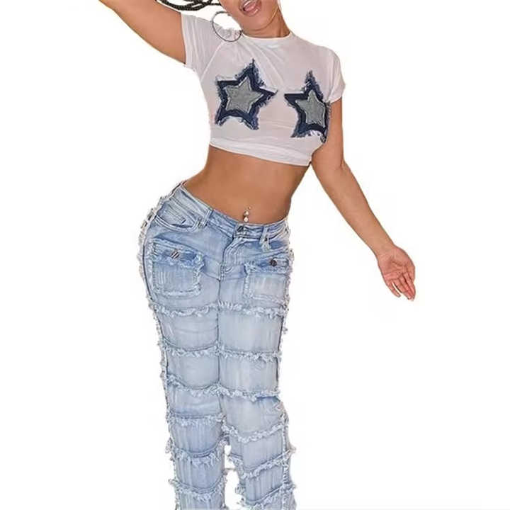 Women's Summer Crop Tops American Short Sleeve Crewneck Star Patch Short T-shirt Casual Basic Slim Tees
