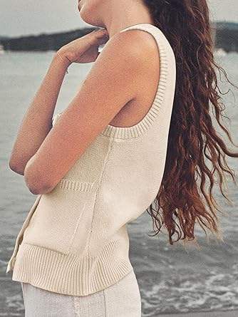 Women's Summer Sleeveless Button Down Shirt Breathable Ribbed Tank Tops with Scoop Neck Striped Pattern Sweater Vest