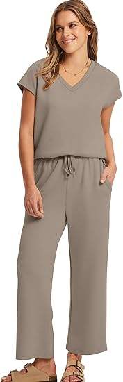 Women's Summer Solid Two-Piece Outfits V-Neck Top Wide Leg Pants Front Logo Breathable Lightweight Vacation Travel Loungewear