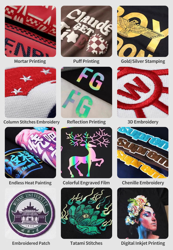 Logo position:Front, back, Left Sleeve, Right Sleeve, lower hem, back neck