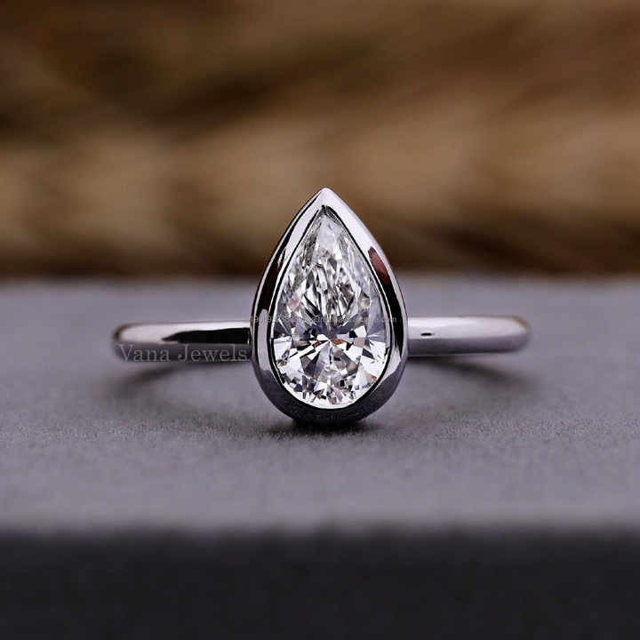 Women's Teardrop Shape Engagement and Anniversary Ring 18K White Gold Bezel Set with Pear Cut Lab Grown Diamond Wedding Ring