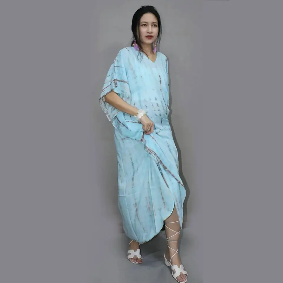 Women's Tie-Dye Kaftan Maxi Dress Sexy V-Neck Summer Beachwear Handmade Woven Breathable Swim Dress Half Sleeve Boho Natural