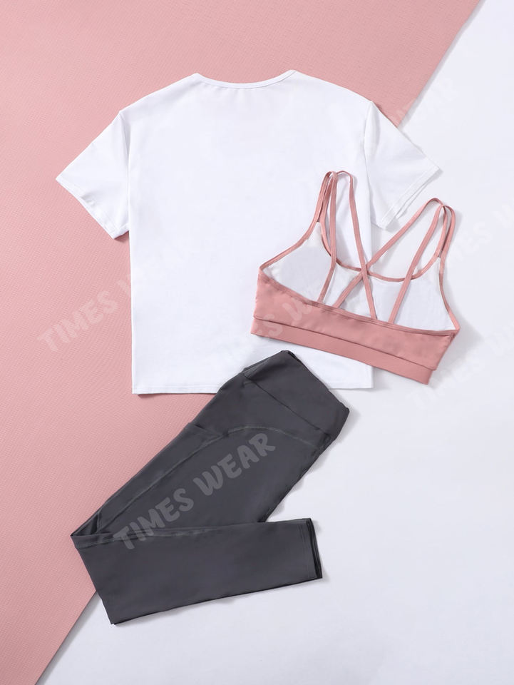 Women's Top Quality Cross Back Sports Bra and Letter Graphic Sports Tee and Sports Leggings Ladies Yoga Set