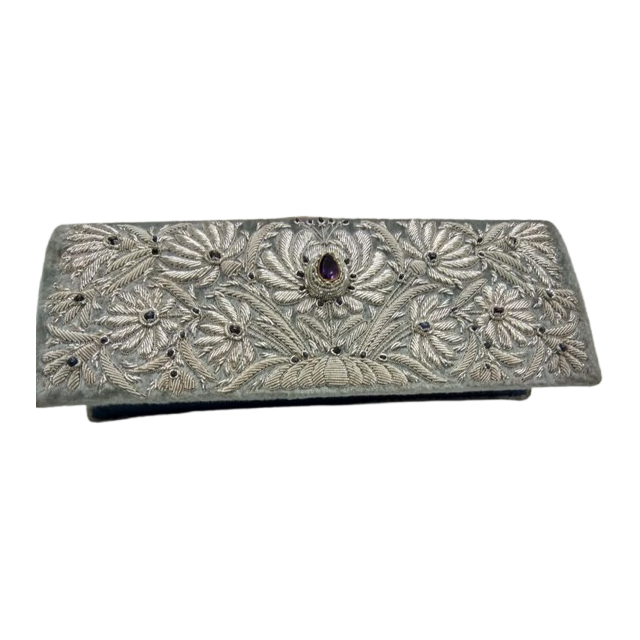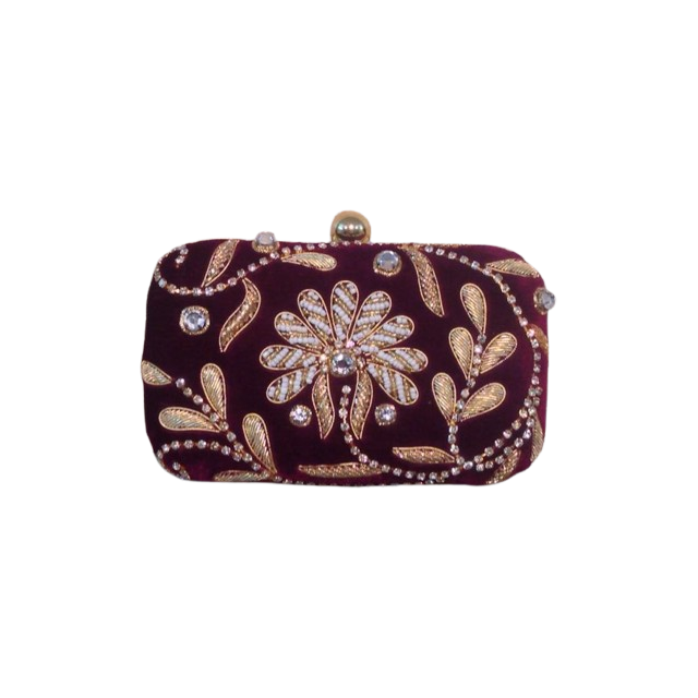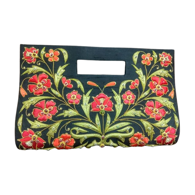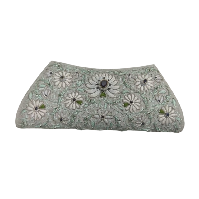 Women's Trendy Fashion-Forward Canvas Clutch with Zipper Top and Semi-Gemstone Decorative Beading Pearl Chain Zari Embroidery