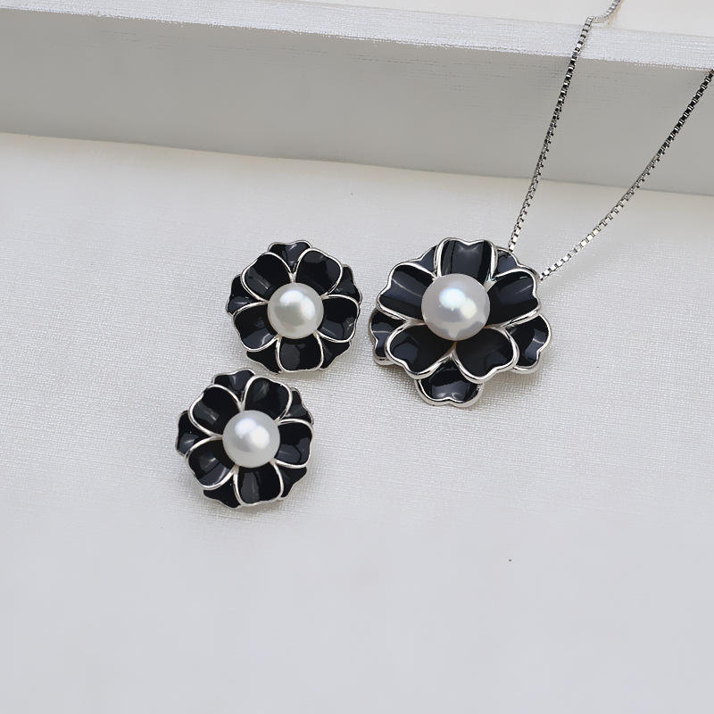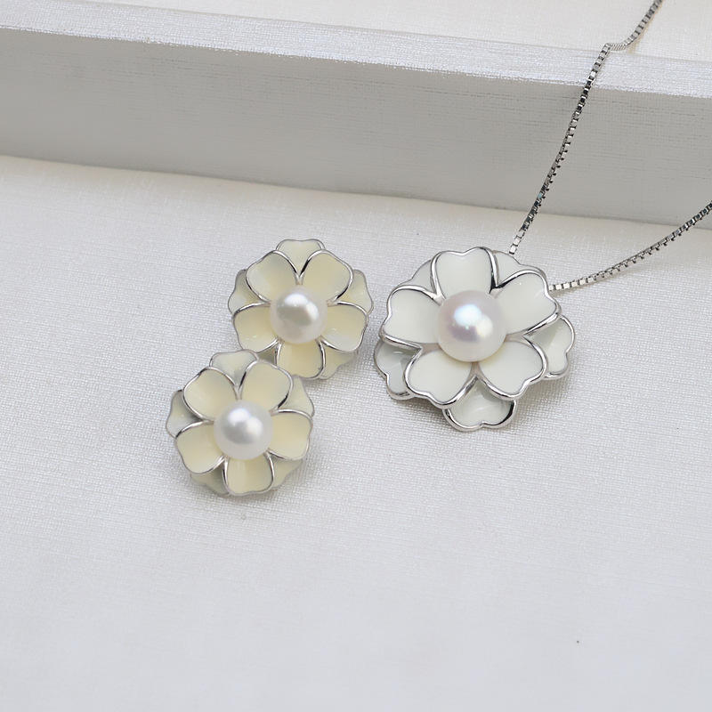 Women's Trendy Fashion Jewelry Set S925 Silver Drop Glue Earrings 9-11 Pearl Flower Shaped Pendant Ring 1281 Hollow Holder DIY
