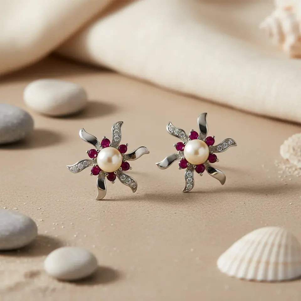 Women's Trendy Silver Pearl & Ruby Flower Stud Earrings Religious Floral Jewelry Gold Plating Diamond Main Stone for Parties