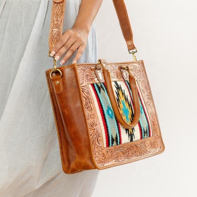 Women's Unique Genuine Leather Handbag Clutch Set New Western Traditional Style Aztec Tooled Embossed Leather Summer Portable