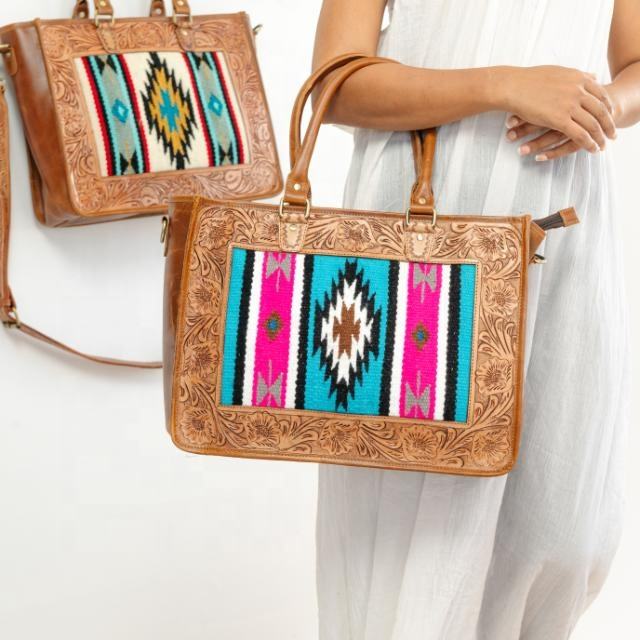 Women's Unique Genuine Leather Handbag Clutch Set New Western Traditional Style Aztec Tooled Embossed Leather Winter Spring