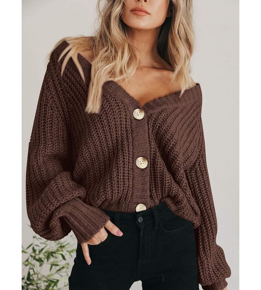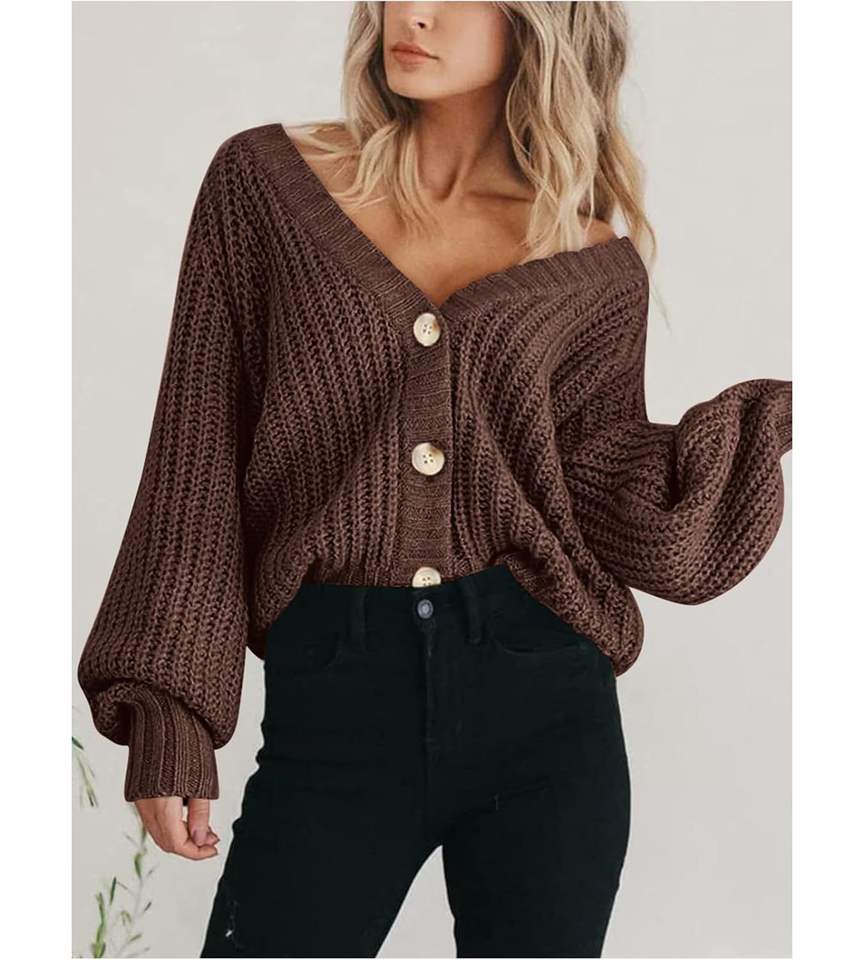 Women's V-Neck Oversized Cardigan Sweater Lantern Sleeves Batwing Button Knitted Casual Loose Fit for Autumn Front Included