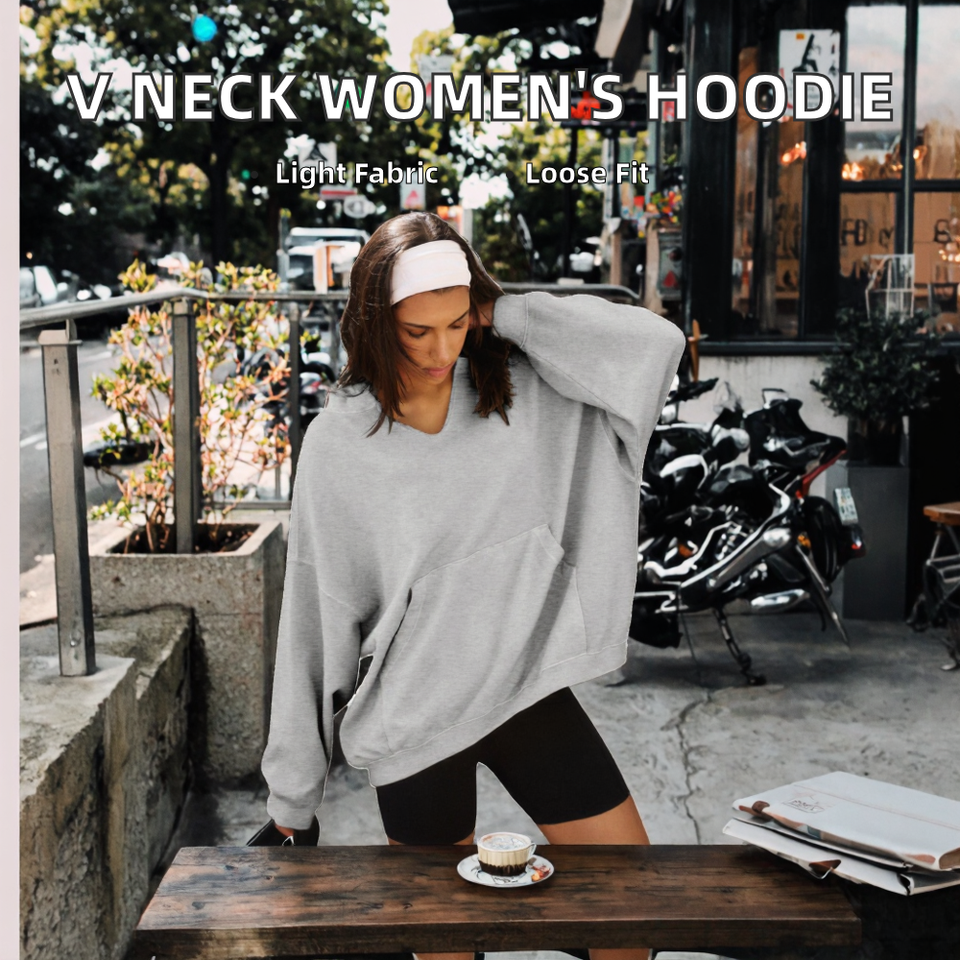 Women's V Neck Oversized Pullover Hoodie Solid Color Long Sleeve Lightweight Loose Sweatshirt with Pocket Plus Size