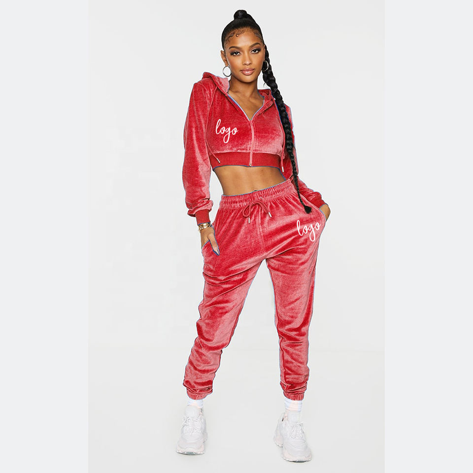 Women's Velour Tracksuit Two Piece Set Long Sleeve Zip up Cropped Hoodies With Pockets High Waist Pants Plus Size Sweatsuit