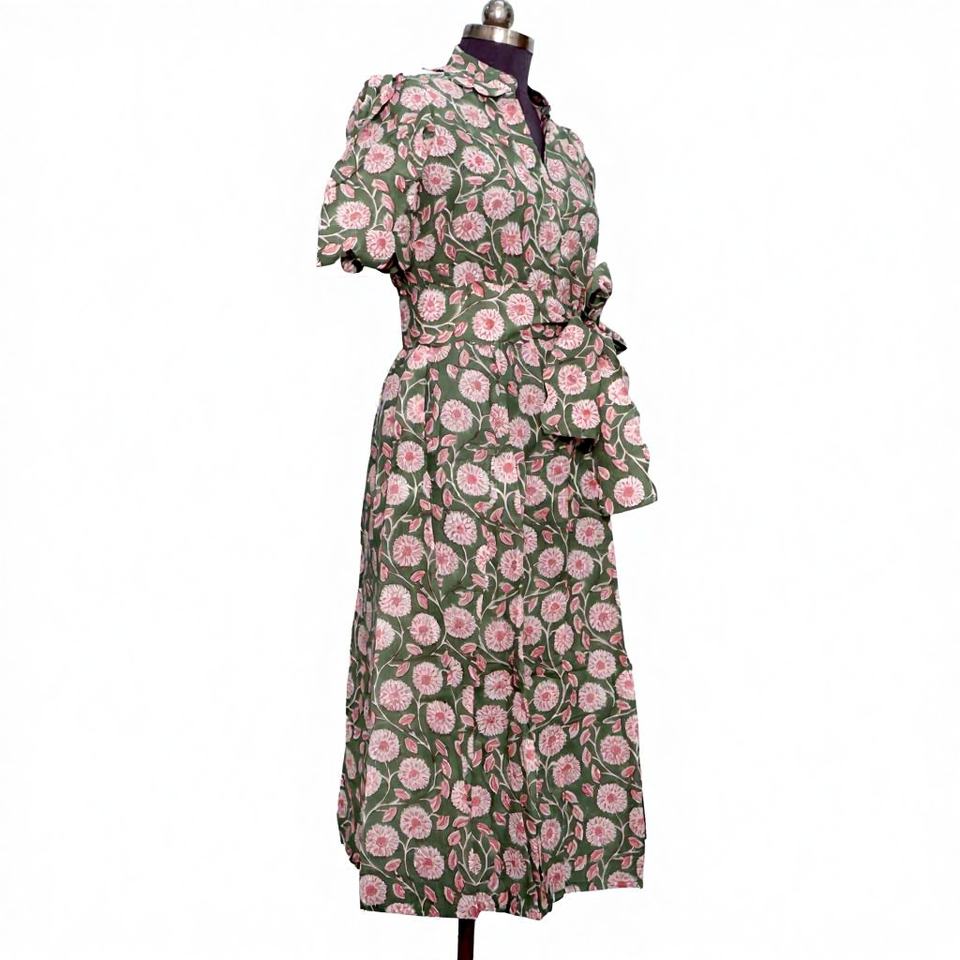 Women's Vintage 100% Cotton Elegant Short Sleeve Floral Print Bohemian Summer Midi A-Line Casual Natural Waistline Belt