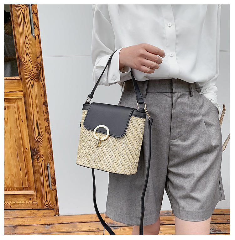 Women's Vintage Crossbody Straw Handbag Small Bucket Bag with Open Closure Woven Hollow Design for Holidays and Fashion-Z0236