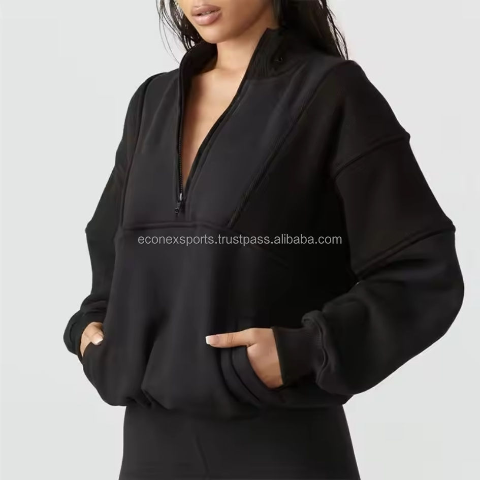Women's Vintage Green Long Sleeve Sweatshirt Stand Collar Zipper Custom Logo Design Emboss Embroidery Loose Fit Half Zipper Puff