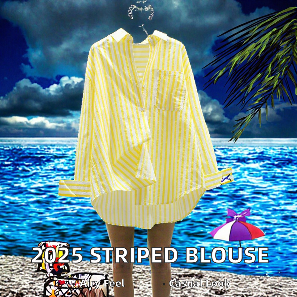 Women's Vintage Striped Commuter Blouse 2025 Summer Polo Neck Long Sleeve Loose Casual Woven Shirt Breathable Simple for Spring