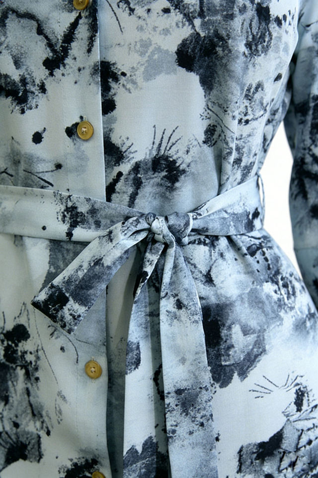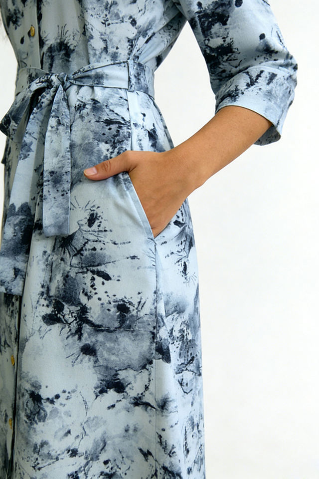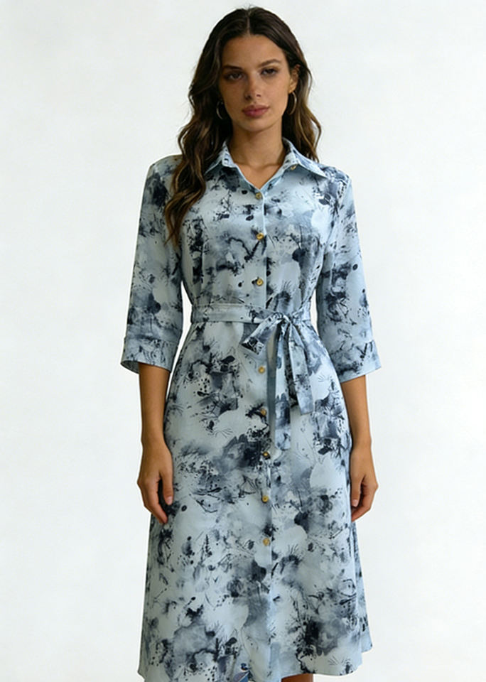 Women's Watercolor Print Polyester Satin A-Line Shirt Dress-3/4 Sleeves Self-Tie Belt Knee-Length Casual Eco-Friendly Dress