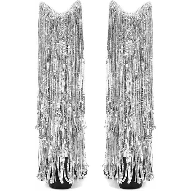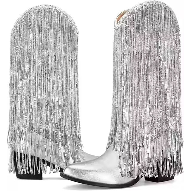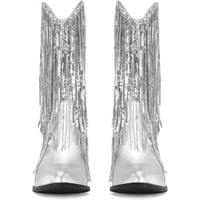 Women's Western Silver Metal Cowboy Style Pointed Side Zipper Chunky Heel Mid Calf Boots