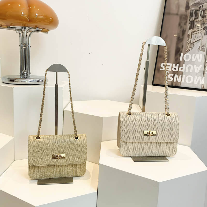 Women's Western Style Straw Crossbody Handbag Solid Color Fashion Chain Decoration Geometric Design Three Straps Winter