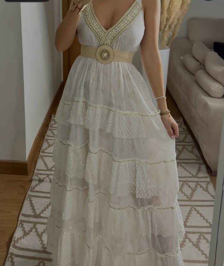 Women's White Cotton Boho Long Maxi Dress with Lace Trim Spaghetti Straps Tiered Design One Piece Fit and Flare Eco-Friendly