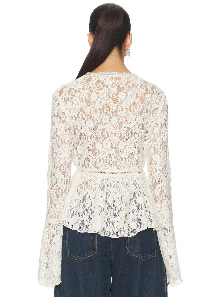 Women's White Creamy Y2K Babe-style Sheer Sexy Ruffled Trumpet Sleeve Lace Deep V Neck Waist-fitted Summer ODM Cardigan Blouse