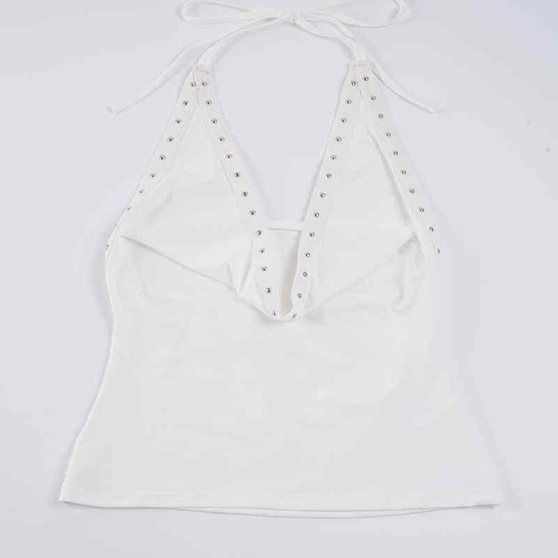Women's White Halter Deep V Neck Tank Top Sexy Studs Decorated Cropped Backless Top for Streetwear and Festival Outfits
