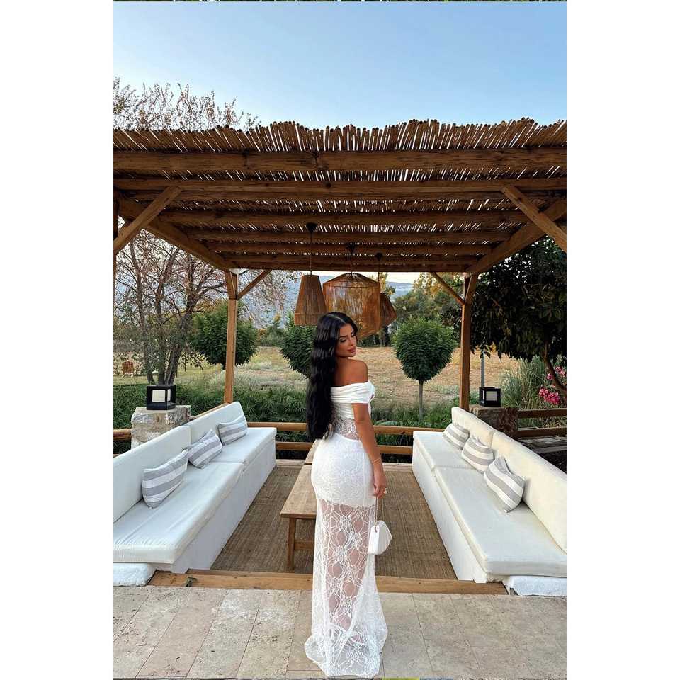 Women's White Lace Detail Ball Gown Evening Dress Formal Party Style Long Length Empire Waistline XS Size for Wedding Guests