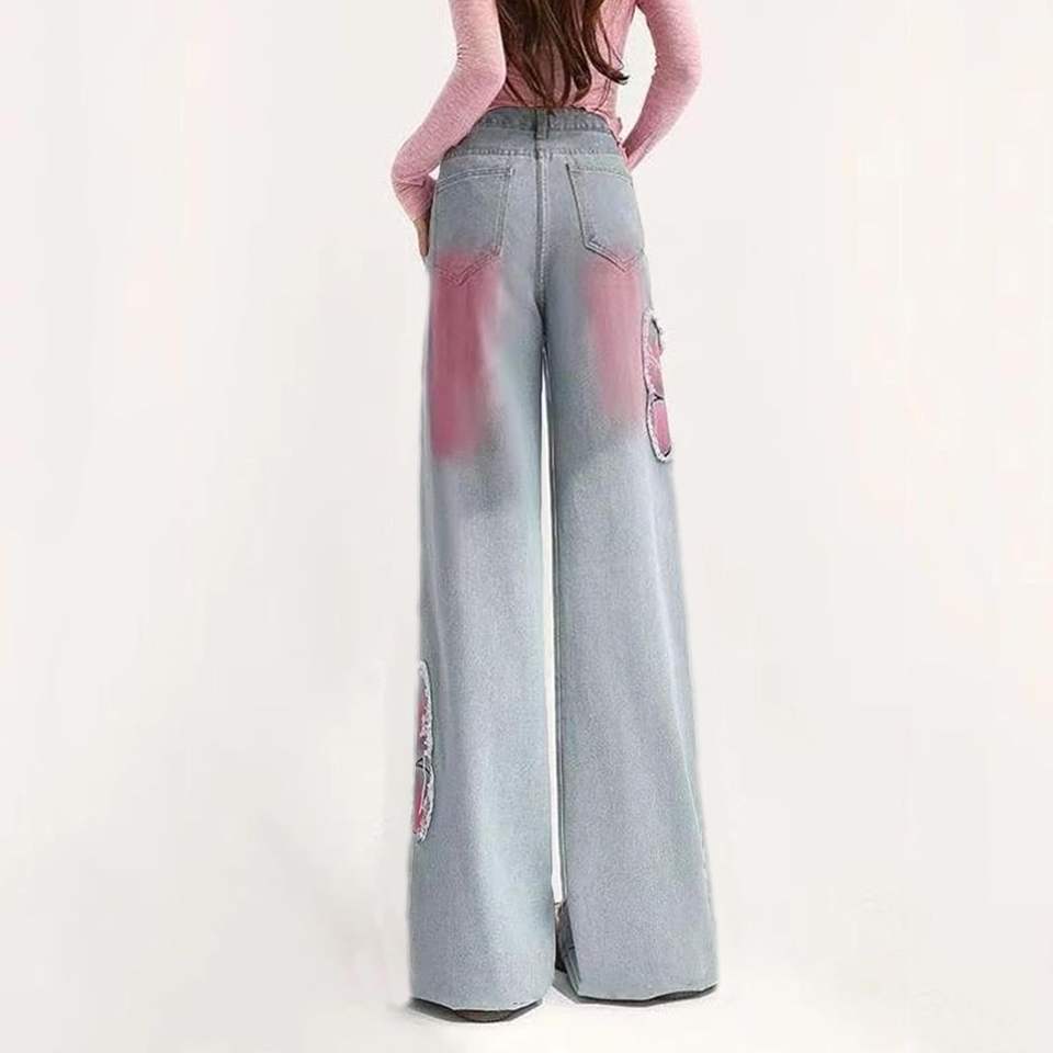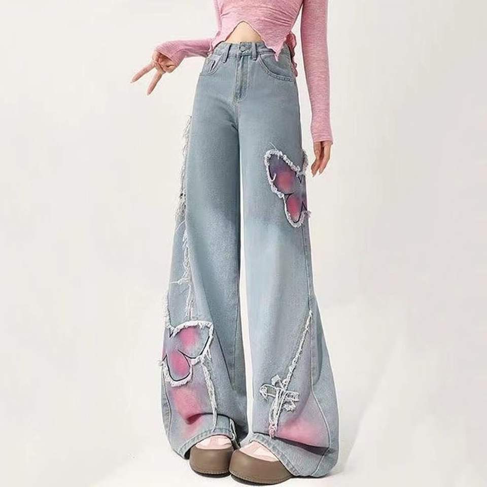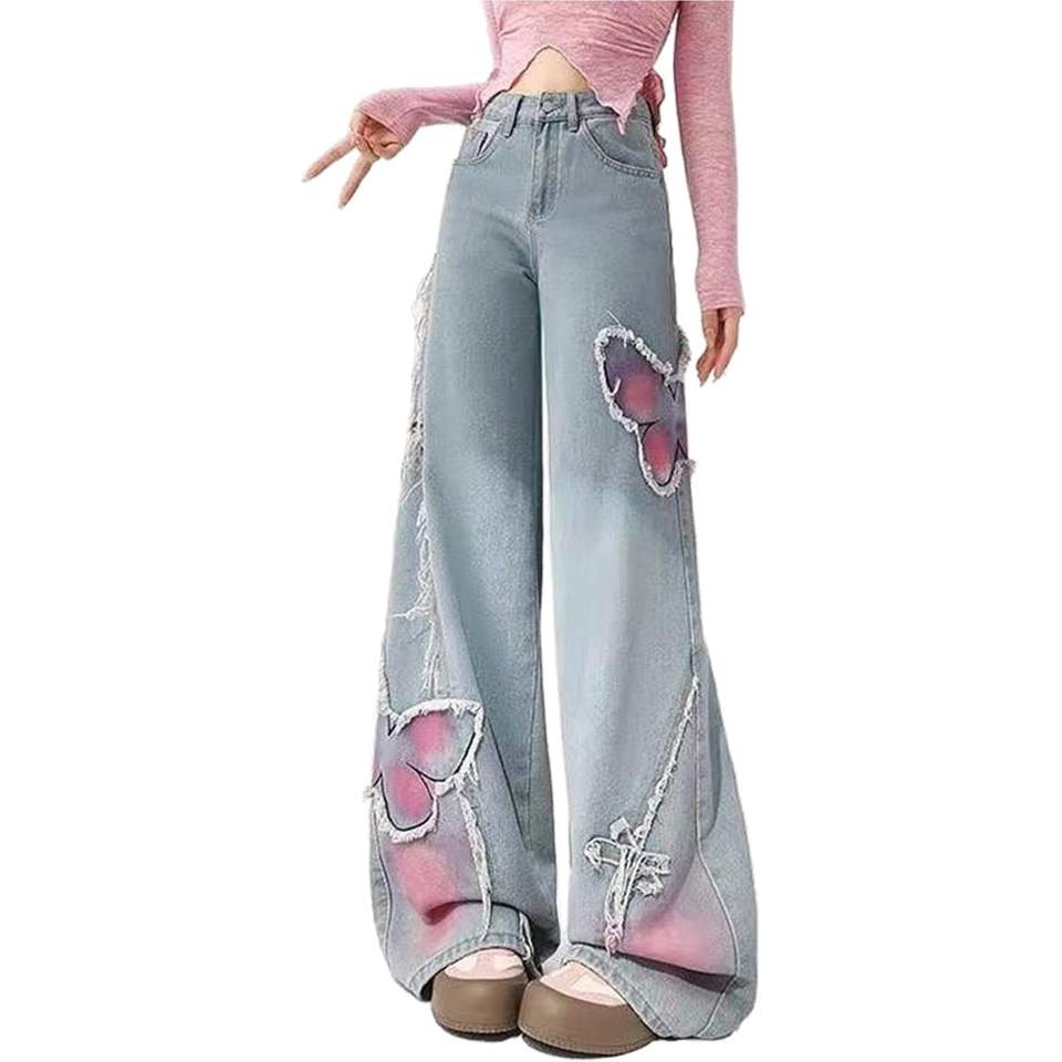 Women's Wide Leg Butterfly Jeans Y2K Embroidered Grunge Baggy Crop Jeans Raw Trim Streetwear for Teen Girls Breathable