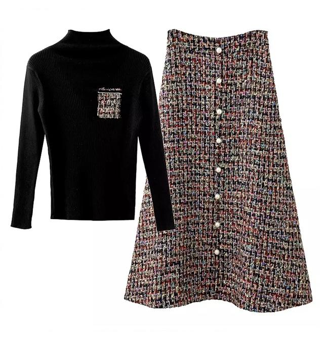 Women's Winter 2 Piece Set Ladies Turtleneck Black Pullovers Button Deco Long Wool Skirt Sets Casual Outfit
