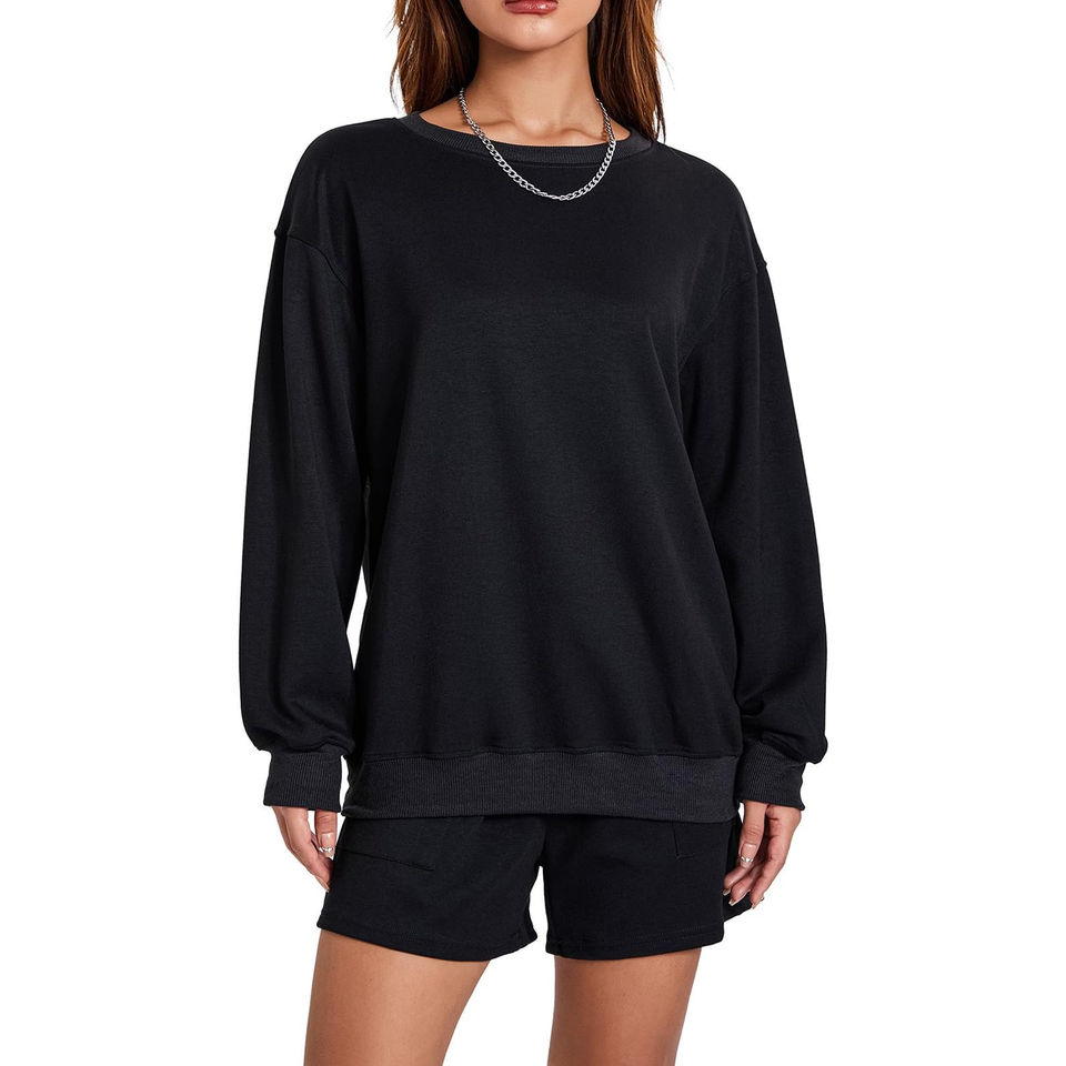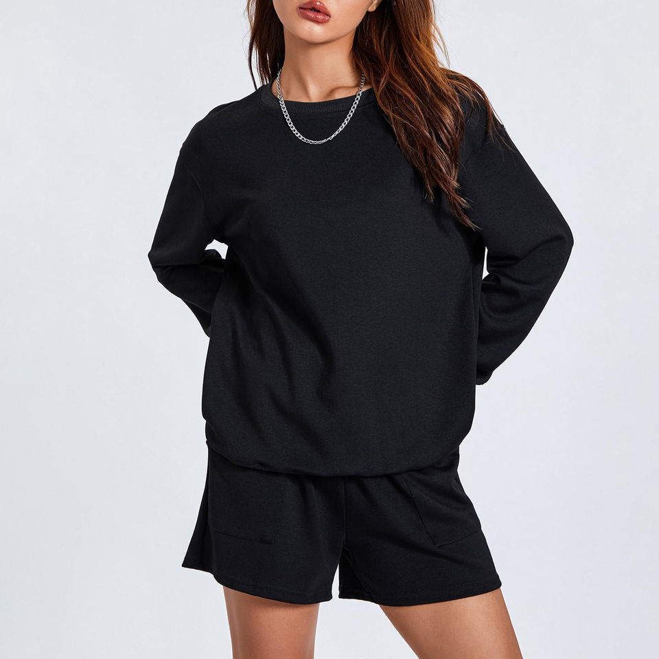 Women's Winter Eco-Friendly Solid Long Black Casual Oversized Sweatshirt & Drawstring Shorts Two-Piece Outfit for Daily