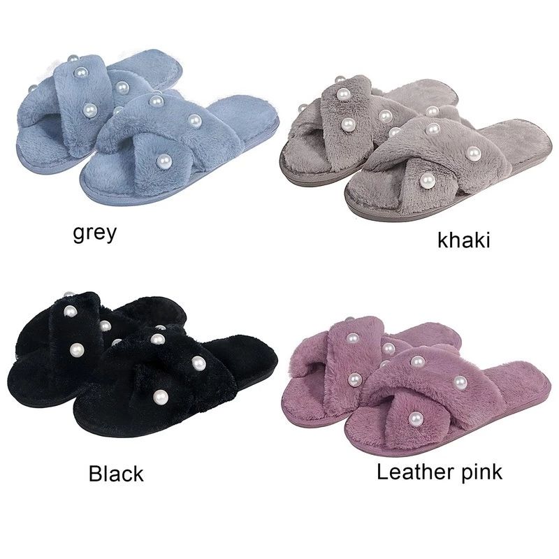 Women's Winter Warm Faux Fur Fluffy Slippers Indoor Pearl Floor Slides Flat Furry Sandals EVA Insole Cross Flip Flops Breathable