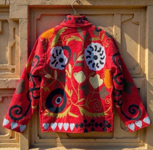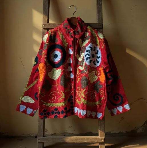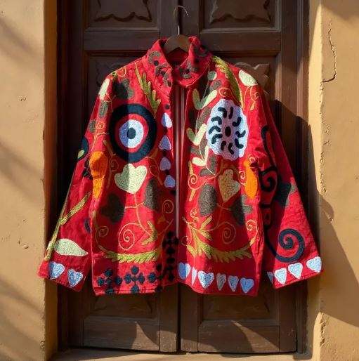 Women's Winter Wear Outer Coat Multicolored Embroidery Cotton Suzani Handmade Full Sleeves Open Front Jacket Printed Fleece
