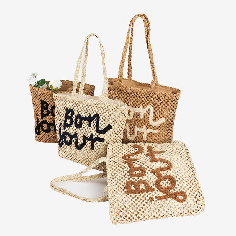 Women's Woven Basket Bag with Openwork Alphabet Embroidery. Vertical Square Design with Large Capacity