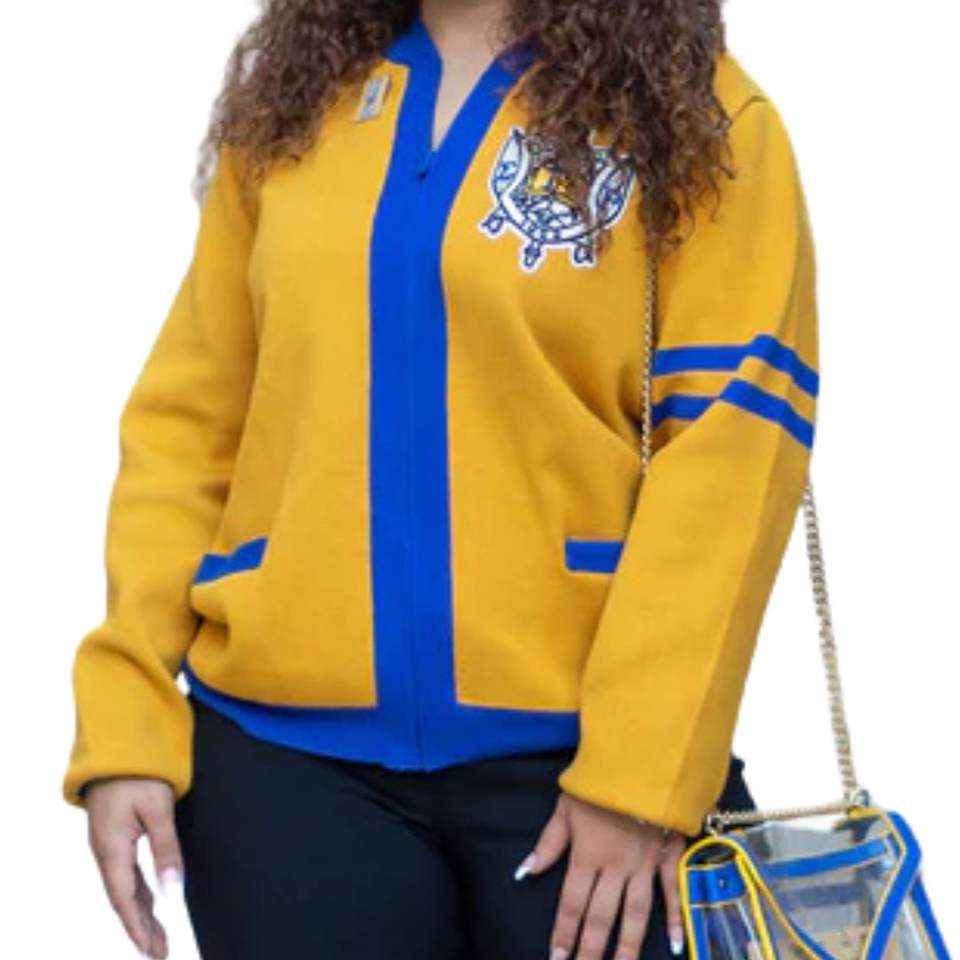 Women's Yellow Knit Bomber with Blue Accents Ribbed Sleeves Sorority Style Lightweight Outerwear for Daily Use